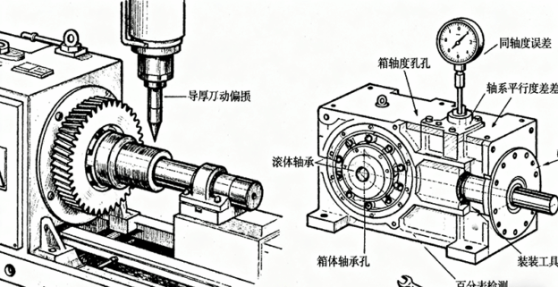 - 箱体自身精度缺陷:减速机箱体的轴承孔同轴度、平行度本身未达设计精度要求,或轴承孔与箱体安装端面的垂直度误差超标,会直接决定轴线装配的基准偏差,为后续误差埋下隐患;